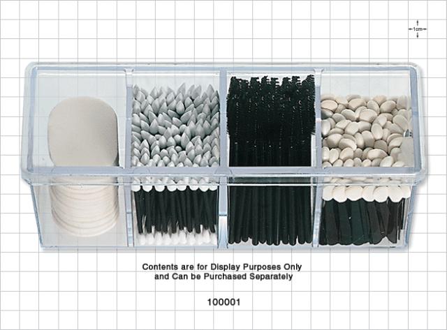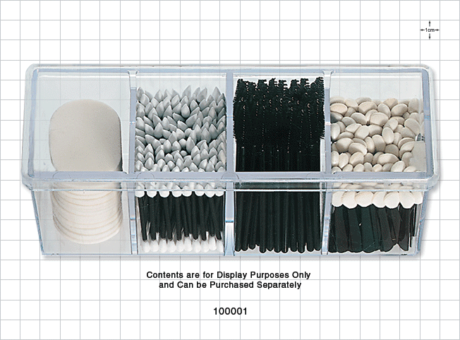 This clear polystyrene beauty organizer box with lid is perfect for storage of disposable swabs, applicators or sponges. Organize your supplies and keep them clean and fresh, ready for your next customer. Contents are for display purposes only and can be purchased separately.