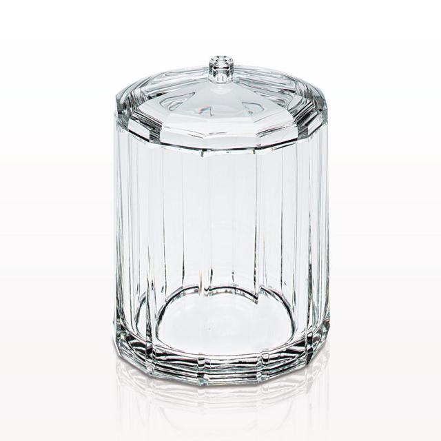 Our luxury faceted acrylic cylinder is suitable for holding swabs and applicators, sponges or cotton balls. The removable lid with molded knob allows for easy access to the contents of this attractive supply container. Use on beauty workspaces, rest room counter tops, or sell these individually boxed acrylics at your own retail counter. Contents are for display purposes only.