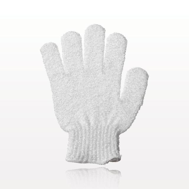 Gently exfoliate the body with this white textured polyester bath glove. Perfect for resale, this item conveniently comes individually packaged in a polybag. It can also be offered as a gift with purchase.