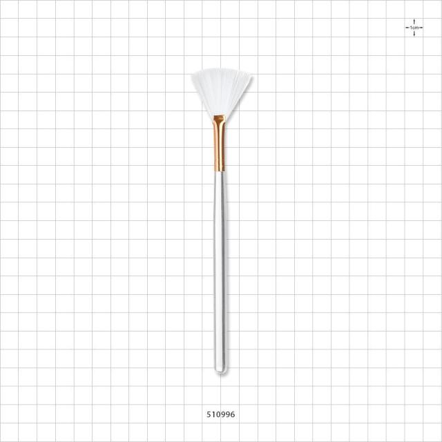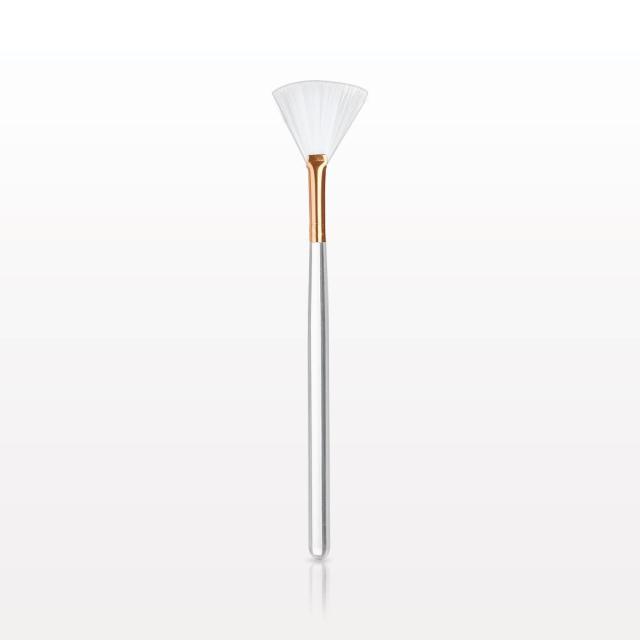 Spread smooth, even layers of skincare during facial treatments with this medium fan brush featuring synthetic nylon hair. Designed with a gold aluminum ferrule and white handle, this brush can also be used to apply small amounts of powdered makeup when contouring and highlighting, or fan away any excess product during a makeover.