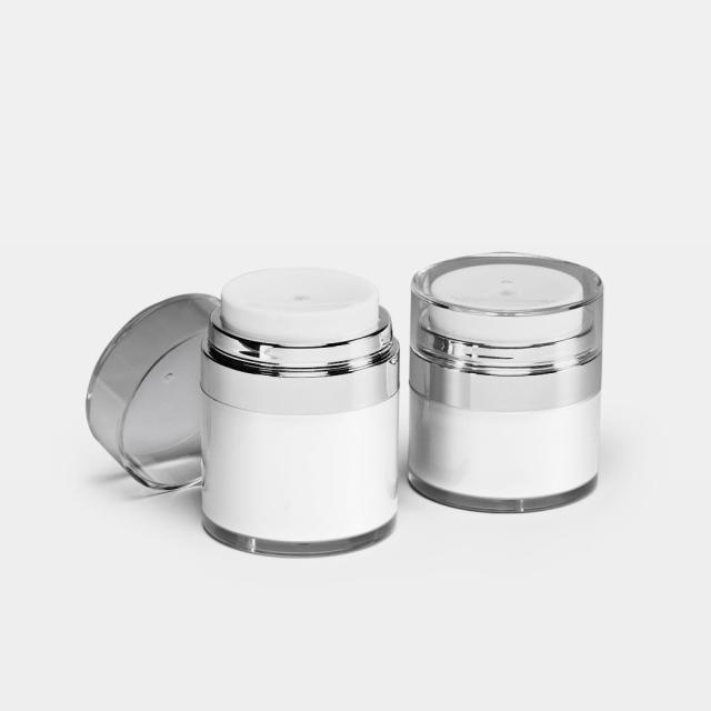 Dose out creams or lotions with this elegant airless jar. The airless pump technology helps prevent product contamination while ensuring the contents are entirely depleted from the jar. Fits with our corresponding white pump with silver trim and clear overcap, Part #29959.