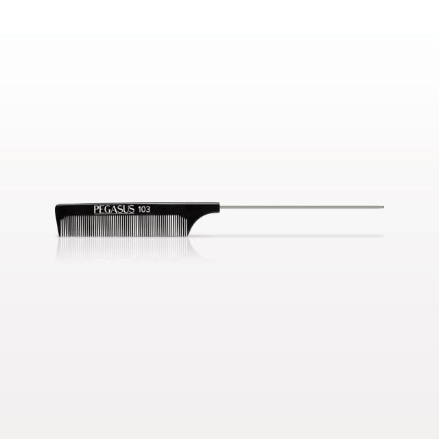This fine-tooth pin tail comb is a must-have for any professional styling kit. Use the thin stainless steel tail on one end to section off and partition hair and then comb it out using the other side. It can also be used for teasing hair to create volume with ease. Made from hard rubber and stainless steel, this tool is scratch and tangle-free, heat-resistant, anti-static, and extremely durable. Crafted with Flexinite Technology, this comb is sensitive to changing temperatures so the perfectly rounded teeth mimic hair and move flexibly, expanding when treated with heat during styling. Includes measuring marks for added convenience.