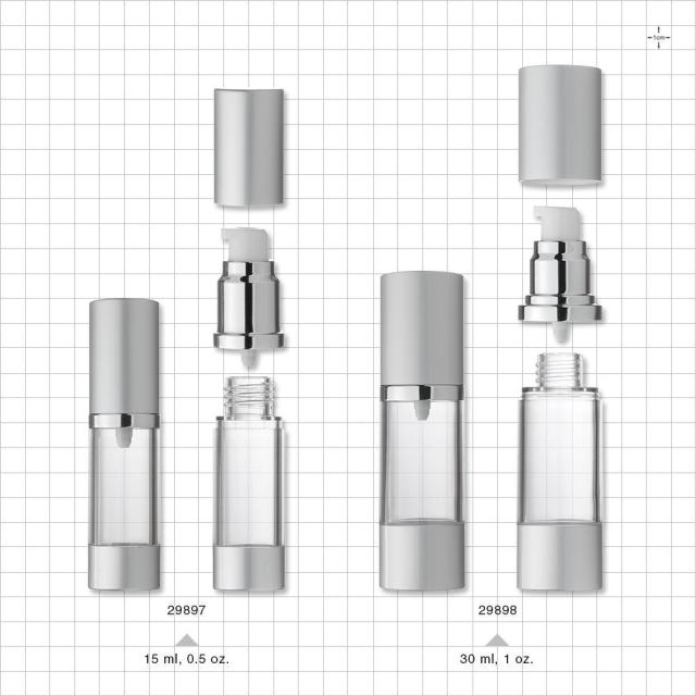 Help maintain efficacy of creams and lotions with this luxurious clear 15 ml airless bottle with platinum cap and base. The airless pump mechanism dispenses all of the product down to the last drop.