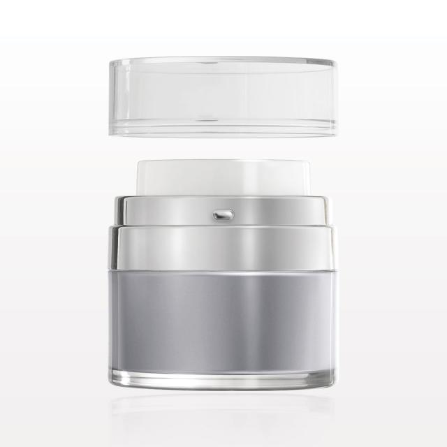 Dose out creams or lotion formulations while preventing air from contaminating the product with this elegant 15 ml platinum airless jar with silver trim and clear cap.