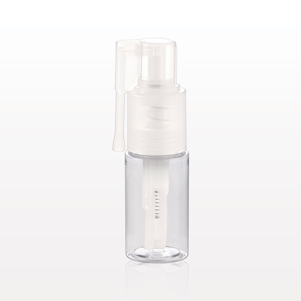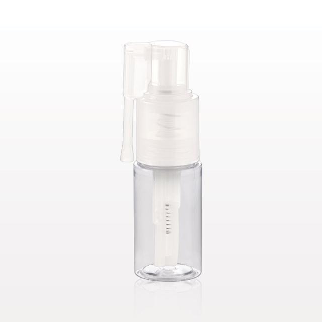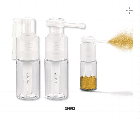 This refillable 30 ml spray bottle features an extended nozzle sprayer for applying powder and glitter formulations. The locking nozzle ensures the product will not spill or escape the bottle during travel or when not in use. The unique interior mechanism helps gather the product towards the inner tube, allowing for maximum product dispersion. Perfect for packaging body powders and performing advanced body painting techniques.