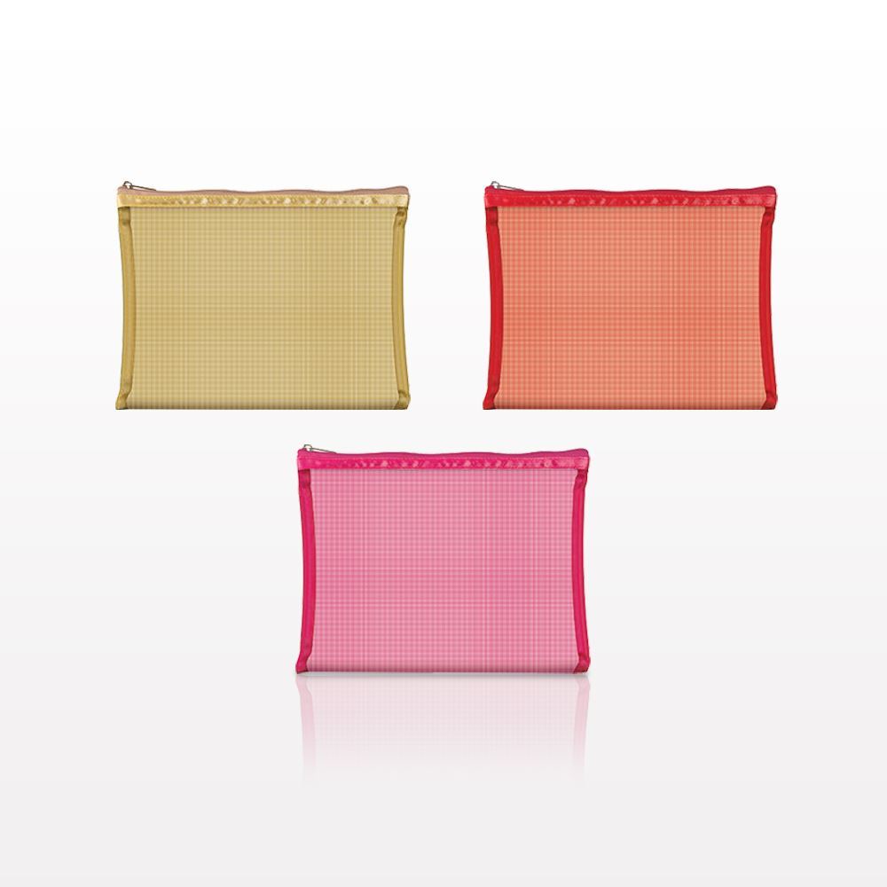 This large gold mesh pouch with zipper closure is perfect for packaging travel sized beauty products, creating promotional giveaways or for retail sale.