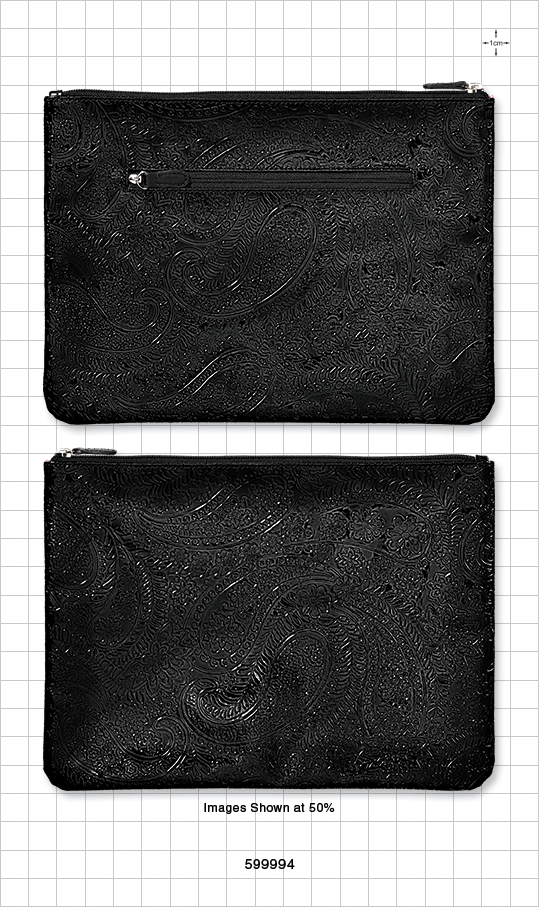 Carry all of your essentials in this elegant, fully lined large clutch with zipper closure from our Paisley Clutch Collection. The black polyurethane material is embossed with an attractive paisley pattern and the vibrant pink inner lining adds a splash of color. The large size of this clutch allows it to also be used as a tablet or small laptop sleeve. This clutch includes an additional outside pocket for added convenience and is ideal to be sold at retail or offered as a gift with purchase.